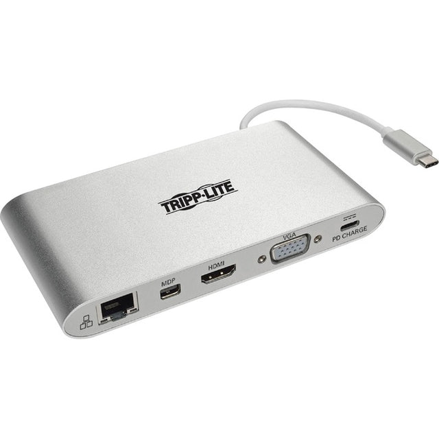 La station d'accueil USB-C 3.1 de 1ère génération transforme votre MacBook, Chromebook, tablette ou ordinateur portable en un poste de travail polyvalent. En connectant son câble intégré au port USB-C ou Thunderbolt 3 de votre appareil, vous pourrez ajouter un écran externe, accéder aux réseaux Gigabit Ethernet, transférer des données, afficher des vidéos et bien plus encore. Les ports Mini DisplayPort (mDP), VGA et HDMI vous permettent de connecter un écran externe (un écran à la fois). Les ports mDP et HDMI prennent en charge les résolutions vidéo UHD jusqu'à 3840 x 2160 (4K x 2K) à 30 Hz. Le port VGA prend en charge les résolutions vidéo HD jusqu'à 1920 x 1200, y compris 1080p, à 60 Hz. Connectez un câble Gigabit Ethernet (vendu séparément) au port RJ45 pour accéder à de véritables vitesses de réseau 10/100/1000 Mbps. Un port USB dédié compatible BC 1.2 fournit jusqu'à 1,5 A de puissance de charge rapide. Les emplacements pour cartes mémoire Micro SD et SD/MMC permettent d'accéder à une mémoire externe. Une prise audio de 3,5 mm est pratique pour connecter des haut-parleurs, un casque ou un microphone à votre appareil connecté.